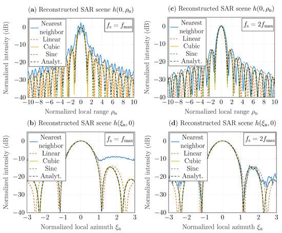 In Figure 5a,b are shown SAR-scene cuts that are reconstructed for the Nyquist rate based on the GBP algorithm and the interpolation methods described in Section 3 and plotted as functions of normalized range (for ) and normalized azimuth (for ). Here, the reconstructed SAR-scene cuts are compared the results provided by the impulse response function (A1) for and . Here, the intensity of cuts is normalized with the intensity value of the SAR-scene center, i.e., with . Furthermore, range and azimuth are normalized similarly to the examples described above. It has been observed that reconstructions obtained with the cubic and sinc interpolation techniques are more accurate both in range and azimuth directions than the results obtained based on the nearest neighbor and linear interpolation algorithms. The results based on nearest neighbor interpolation contain strong distortions in range and indistinguishable sidelobes in azimuth. The reconstructions based on cubic and sinc interpolations have the same azimuth resolution as the analytically-based result (A1); see Figure 5b. However, in comparison with the SAR-scene cuts based on sinc interpolation and (A1), based on the cubic interpolation algorithm has lower range resolution; see Figure 5a. It has also been investigated that sinc interpolator provides the most accurate reconstruction results in terms of the peak-sidelobe ratio (PSLR) (A4), which is introduced in Appendix B, and the root mean square error (RMSE). The PSLR-deviation of SAR scene h, which is reconstructed with sinc interpolation, from the analytical solution at the Nyquist rate is around ; see the calculated PSLRs in Table 2. It should be noted that PSLR of h obtained with the extended linear interpolation procedure is higher (-deviation from the analytical PSLR) in comparison with the ratios of scenes obtained with the extended cubic and sinc interpolation approaches. To determine RMSE, we used the results obtained via the impulse response function (A1) as reference values; the results are summarized in Table 3. The results for SAR scene cuts in the range and azimuth directions demonstrate that the extended sinc interpolator provides the most accurate results at the Nyquist rate with an error around . Note that linear and cubic interpolators provide good accuracy with deviation from the reference results around and , respectively, in range, and around and in azimuth, respectively. In the case of the nearest neighbor interpolator, the upsampling procedure is required.
