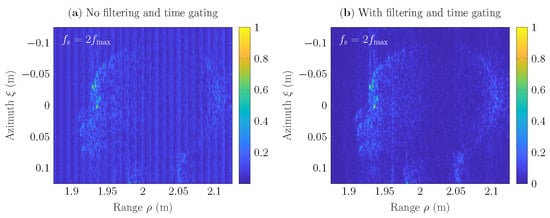 In Figure 7 is shown comparison of SAR scenes of pixels that have been reconstructed from the acquired raw data . Here, nearest neighbor interpolation algorithm (7) has been used as a part of GBP to reconstruct SAR scenes, and the sampling rate is . Figure 7a, depicts the result, where the raw data has not been filtered and time-gated. The scene contains noise, which is caused by reflections of the surrounding environment, as well as by the absence of the phase control procedure in the nearest neighbor interpolation algorithm. In Figure 7b, the SAR scene has been reconstructed from the raw data, which has been postprocessed, i.e., filtered in the frequency domain and time-gated. It has been observed that the postprocessing procedure allows us to suppress ringing noise in the SAR scene and improves the visibility of the object under test. Nevertheless, the SAR scene in Figure 7b contains distortions, which requires the use of other interpolation methods to suppress them and, furthermore, an investigation of the appropriate sampling rate. Thus, in the rest of the examples, the acquired raw data will be filtered in the frequency domain and time-gated.