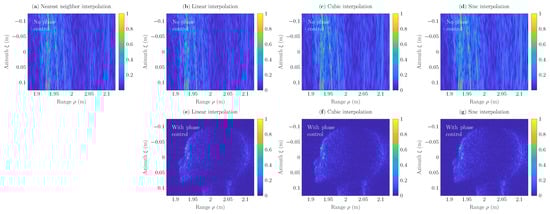 which is only used under the local interpolation procedure to estimate . Here, the proposed procedure assigns the information about the range time difference between the pixel in the defined image plane and the target to the samples to be used in the interpolation procedure. Correspondingly, the interpolated parameter will contain the assigned phase information. Interpolation algorithms that include the proposed phase-control procedure (6) will be described in Section 3.