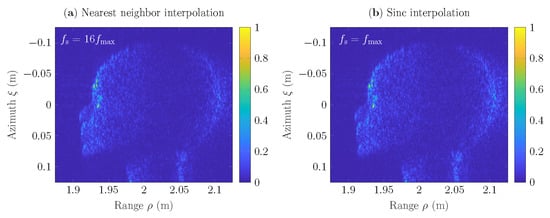 In Figure 9 is depicted the comparison of SAR scenes , the reconstruction of which has been based on the incorporation of nearest neighbor and sinc interpolators into the GBP algorithm. Here, the results based on the nearest neighbor approach are given for the rate and provide approximately similar accuracy, as the results obtained via the sinc interpolation at the Nyquist rate . The comparison demonstrates that to obtain an accurate reconstruction of the object under test, even at the Nyquist rate, it is enough to employ one of the proposed extended interpolation algorithms that contain the phase control procedure (6) into the GBP algorithm (2).