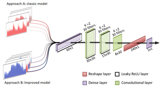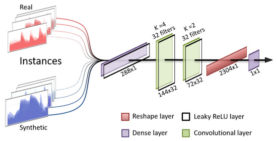 For the discriminator, the chosen structure is an adaptation of image classification models, consisting of a sequence of convolutions and leaky rectified linear units (ReLU) layers and has an output layer of a single neuron with a sigmoid activation function. This forces the discriminator to produce output values of 0 or 1, representing “synthetic” and “real”, respectively. The structure of the discriminator is presented in Figure 2.