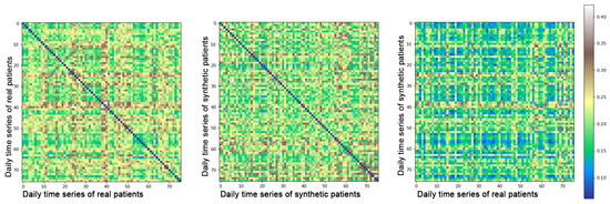 Heat maps with the JS comparison are included in Figure 4 as an exemplification of the models performance when it comes to evaluating how original the synthetic data are. It can be observed that when comparing real–real samples, JS values of 0 appear represented in dark blue on the heat map, meaning that those samples are identical. To identify how similar generated samples are between themselves, we have studied the second heat map of the figure. We can notice that there are no repeated samples, as no dark blue values are represented out of the diagonal. To prove that the proposed method does not identically replicate the original data, the last heat map shows a comparison of real–synthetic data, and as to whether all values tend to be lower than in the real–real comparison, no identical (zero value) comparisons appear. We present all three heat maps only with samples of patient number 1 of the Barcelona data as an example, although these heatmaps present similar patterns for each of the individual patients used in the study.