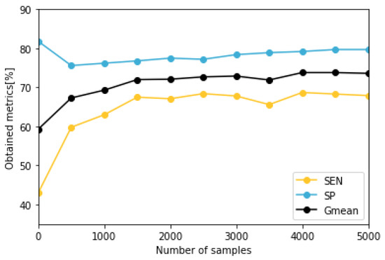 To train and evaluate the predictive model, patients with less than five nocturnal hypoglycemic events (B4, O1, O3, and O5) have been discarded as the reduced amount of events is an important methodological limitation and makes testing data unsuitable to evaluate the classifier accurately. The models corresponding to the remaining patients have been validated with a stratified k-Fold cross validation method, using for each fold different train and test data. To determine the optimal number of days to use in the augmented data set, we have calculated the median metrics of the models trained with different number of synthetic samples. We have generated data sets of between 500 and 5000 instances and trained the predictive model 20 times for each patient and number of synthetic days. We have observed that the results improve with a higher number of samples, although for values higher than 1500 synthetic samples, the increase is slow, as presented in Figure 5.