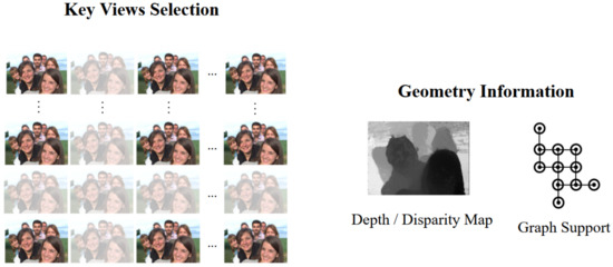 The most recent geometry-assisted based LF representation does not rely heavily on stacking viewpoints or try to consider the whole LF content as a 2D/3D video, hence, it depends less on traditional coders, and has high potential for improvement. Instead, research into this category focuses on key view selection and geometry estimation problems (i.e., depth estimation for LF [28,29,30,31,32]), as depicted in Figure 1.