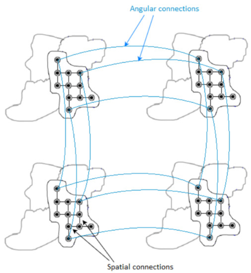 A super-ray graph consisting of spatial graphs connecting pixels within a super-pixel and angular graphs connecting corresponding pixels across views. , , , are four adjacent views.