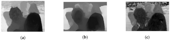 Disparity maps obtained using optical-flow-based and stereo-based depth estimators in the dataset . (a) Estimated disparity map of top-left view using [29]. (b) Estimated disparity map of center view using [30]. (c) Estimated disparity map of center view using [31].