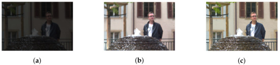 However, in the case of real LF with high parallax (13 × 13 views), the obtained depth map might lose these properties due to the vignetting effect, even after being de-vignetted using color correction methods. A comparison between the top-left view and center view of dataset [40] with 13 × 13 views is shown in Figure 7a,c. The original top-left view can be seen with significant degradation in intensity and color. Gamma correction can be used for color calibration, and thus help reduce vignetting considerably, as seen in Figure 7b. However, a close look at the calibrated top-left view reveals that object details are blurry with minor distortion in the colors, yet its estimated disparity map is severely affected. It is much worse compared to the output in center view using the same optical flow-based [29] or stereo-based [30,31] depth estimation, illustrated in Figure 8. For example, the fountain, which is closest to the camera, now shares the same depth as some of objects in the background (i.e., tree), whereas a segment of the wall now becomes the closest, according to its depth. The instances which have shown even a minor vignetting effect can result in significant deterioration of the estimated depth map in peripheral views.