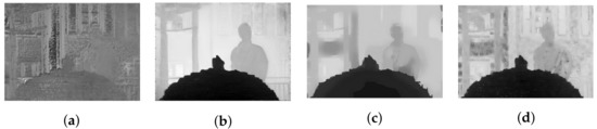 Disparity maps obtained using optical-flow-based and stereo-based depth estimators in dataset . (a) Estimated disparity map of top-left view (gamma corrected) using [29]. (b) Estimated disparity map of center view using [29]. (c) Estimated disparity map of center view using [30]. (d) Estimated disparity map of center view using [31].
