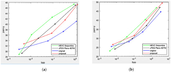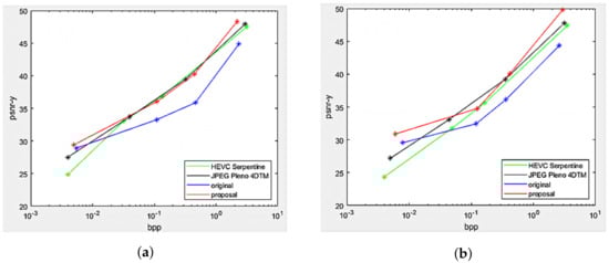 The Rate Distortion performance of the proposed projection with center view as reference was compared against top-left view projection [8], direct encoding of the views as a PVS using HEVC-Serpentine, and 4D transform solution utilizing JPEG Pleno 4DTM. The performance comparison was made on the two datasets and , as shown in Figure 13. Substantial gains in the Center view projection proposal can be seen compared to the original scheme at all bitrates for both datasets, as well as the proposed scheme outperformed HEVC-Serpentine and JPEG Pleno 4DTM, especially at low and high bitrates.