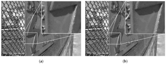 At the decoder side, the luminance channel of LF was reconstructed from the quantized coefficients sent by the encoder. The output results using the original and proposed projection scheme are shown subjectively in Figure 14 for , and Figure 15 for . It can be seen that in both datasets, the proposed Center view projection returned sharper results, clearly visible in edges around texture, whereas the original scheme’s results seemed to be blurry in these edges. The blur effect could be caused by super-pixels reconstructed at inaccurate positions, resulting from poor depth estimation, as a consequence of vignetted top-left view.