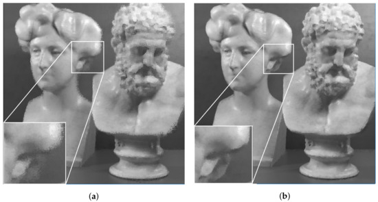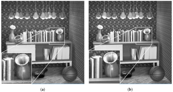 Reconstructed luminance channel of center view using projection scheme from top-left view and center view, in dataset . (a) Top-left view projection scheme [10] (original). (b) Center view projection scheme (proposal).