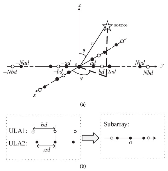 The composition of a subarray is indicated in Figure 1b, where two uniform linear arrays, ULA1 and ULA2, are superimposed, which are denoted by and , respectively. ULA1 and ULA2 are symmetric ULAs with array element spacing and , respectively, where a and b are coprime integers , , and denotes the wavelength of the incident signal. Assuming a subarray contains M omnidirectional sensors, the positions of all sensors in an axis are in the set , , where .