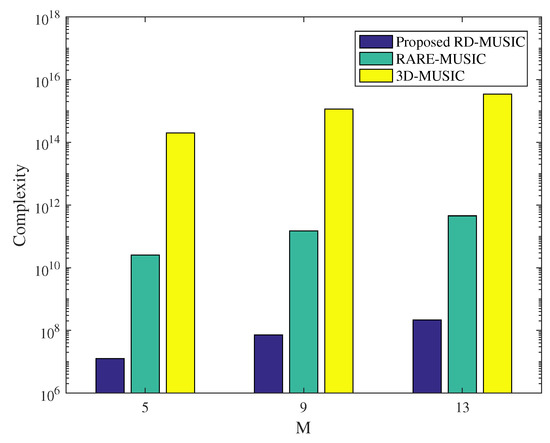 Figure 2 exhibits the complexity comparison of three different algorithms with the SSCA, where , , , and . It can be obviously found that the complexity of the traditional 3D-MUSIC algorithm is much higher than that of the other two algorithms due to , under the same array structure. Moreover, the complexity of the first part of the proposed RD-MUSIC is mainly caused by the two 1-D search for angles, which is significantly lower than that of the RARE-MUSIC. Moreover, although both the RD-MUSIC and RARE-MUSIC algorithms separate the angle and range terms in the same manner, the global complexity of the former is lower than that of the latter. This is because only two 1-D searches are required for the elevation and azimuth angles in the proposed RD-MUSIC algorithm, whereas a 2-D joint search for these two angles is needed in the RARE-MUSIC algorithm.