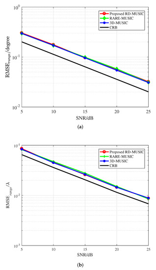 In this section, comprehensive simulations to verify the validity of the proposed RD-MUSIC algorithm are provided. The root mean square errors (RMSEs) of the estimation for angles and range are used as the evaluating indicators of the performance, which are given, respectively, by