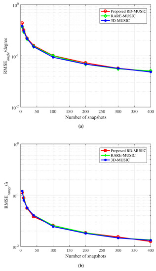 Figure 4 indicates the estimation performance of algorithms under different snapshots when SNR = 18 dB. It can be found that the estimation performance of the proposed algorithm will be improved as the number of snapshots increases. From Figure 3 and Figure 4, the statistical performance of the proposed algorithm based on the MUSIC can almost reach that of 3D-MUSIC estimation.