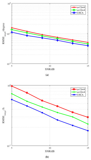 RMSEs versus SNR. (a) DOA estimation. (b) Range estimation.