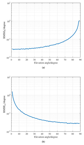 RMSEs versus the elevation angle when . (a) RMSE of elevation. (b) RMSE of azimuth.