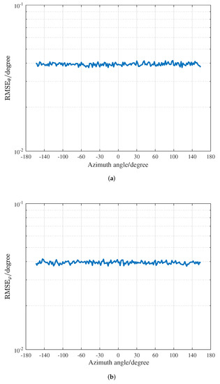 RMSEs versus the azimuth angle when . (a) RMSE of elevation. (b) RMSE of azimuth.