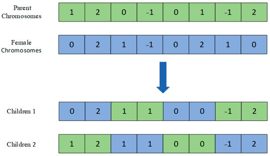where represents the th position of the offspring chromosome, of is the th position on the paternal chromosome . is named crossover rate, indicating the threshold selected. Normally, each gene of the first progeny is selected with probability from either parent, and each gene of the second progeny is selected from the corresponding parent selected by the first progeny gene. The uniform crossover process is shown in Figure 3.