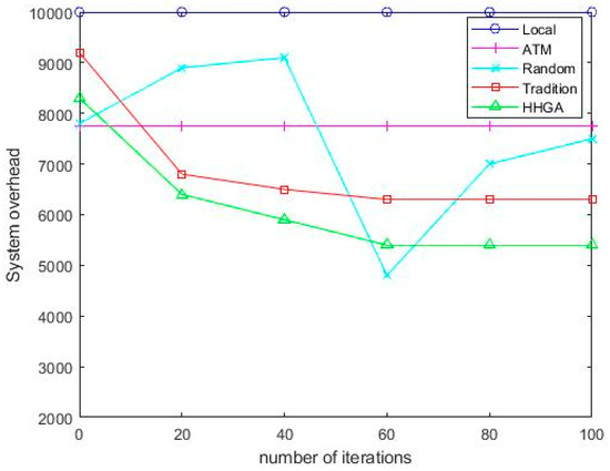 Figure 4 shows the changes in system overhead of five offloading schemes as the number of iterations increases. As it can be seen from Figure 4, the system overhead of the HHGA algorithm is lower than that of the GA algorithm. Since the GA algorithm tends to fall into local optimum, the HHGA algorithm added to a mountain-climbing algorithm can improve this problem well. Both HHGA genetic algorithm and GA algorithm are superior to Local, ATM, and Random. Even though the system overhead of the Random algorithm is lower in rare cases, the overall overhead of the Random algorithm was much higher than that of the HHGA algorithm in this paper. Because the Random algorithm offloads tasks to the cloud through Random selection, tasks were randomly offloaded to mobile vehicles, MEC servers, roadside vehicles, and cloud servers for execution, which has certain randomness. As the number of iterations increases, the Local algorithm stays the same because all tasks are executed locally with no transport costs, but the system overhead is still high. Compared with the other four offloading schemes, the task offloading strategy proposed in this paper was based on roadside parking cooperative moving edge computing achieves the minimum system overhead.
