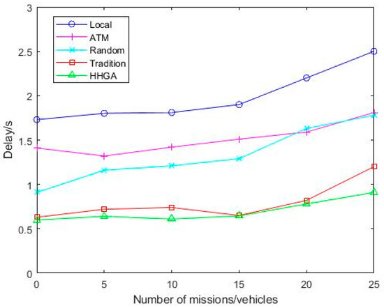 Figure 5 shows the delay changes of five offloading schemes as the number of tasks increases. It can be seen from Figure 5 that the Local algorithm has the highest latency, which indicates that the offloading of computational load can reduce the execution time of the task. When the number of tasks is 20, the delay of the ATM algorithm suddenly increases because when the number of tasks reaches a certain value, the computing resources allocated by MEC to vehicles carrying tasks are not as much as the local resources, so the delay of ATM algorithm is higher than the Local delay. When the number of tasks is 25, the delay performance of the HHGA algorithm improves by 52.1%, 27.6%, 28.8%, and 24.1%. It can be seen that with the increase in the number of tasks, the delay of different strategies increases. Due to the limited computing capacity of terminal devices, channel band resources are limited. As the number of tasks increases, the load of computing equipment increases, and the limited wireless resources cannot cope with the increase in the number of tasks. Because the HHGA algorithm can quickly make offloading decisions and effectively optimize the system costs, the delay of the HHGA algorithm is minimal, respectively, compared with Local, ATM, Random, and Tradition. Therefore, the HHGA algorithm in this paper had the minimum delay compared with other offloading schemes.