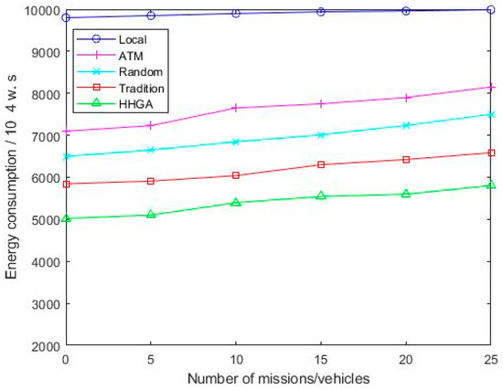As it can be seen from Figure 6, the energy consumption of the ATM algorithm increases rapidly as the number of tasks increases. This is because the ATM algorithm does not consider the computing resources of a cloud server, which brings greater energy consumption to the moving vehicle. Compared with ATM algorithms, Random, HHGA, and Tradition algorithms of cloud servers have obvious energy consumption reduction. As the number of tasks increases, the offloading scheme proposed in this paper has smaller energy consumption compared with other schemes.
