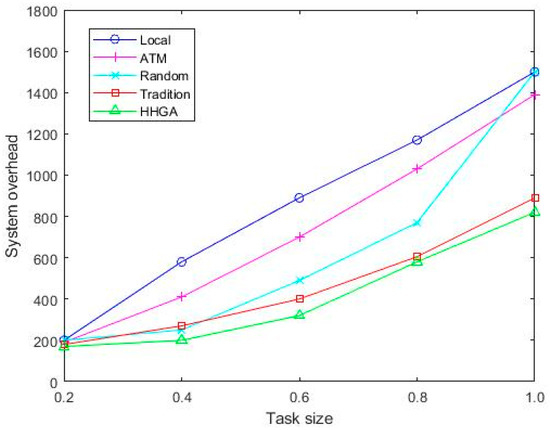Comparison of system overhead of various algorithms under different task sizes.