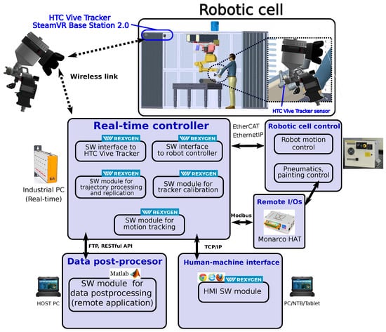 The HW part involves the motion sensor, industrial PC serving as a real-time controller, add-on input/output peripherals and communication interfaces. The SW modules implement methods and algorithms responsible for motion tracking, real-time trajectory recording, post-processing and replication via an employed robotic arm manipulator. A detailed description of the HW and SW components follows in the next sections.