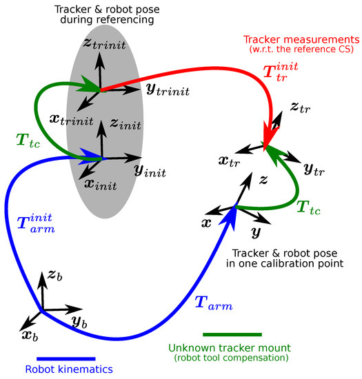 We assume that the kinematic structure of the robot arm to be used is known precisely, including all necessary parameters such as link lengths and relative orientation of rotation axes. Manufacturers of industrial robots commonly provide such data, or they are known in the case of custom robot design. Therefore, it is possible to compute the robot flange position and attitude from the actual measured joint positions. Standard industrial robots achieve end-effector motion repeatability in the order of ±0.01 mm. Thus, we consider robot positioning error negligible with respect to motion tracking error achievable with the optical tracker system that is about two orders of magnitude higher. This allows us to take the robot positions as reference values for the tracker calibration. Moreover, absolute positioning accuracy is not an issue since we use a difference-based method, as will be described further.