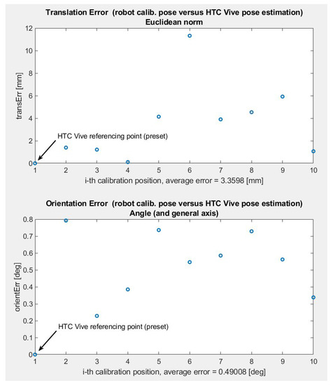 - Reasonable real-time tracking precision—submillimeter range for static/slow-motion position and <0.1 attitude estimation errors, with an increase of factor 10 to 50 during dynamic motions [27,28], which is sufficient for moderately demanding applications of industrial robots