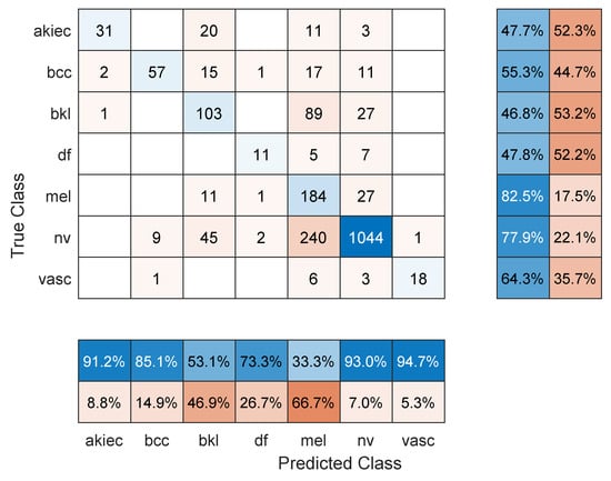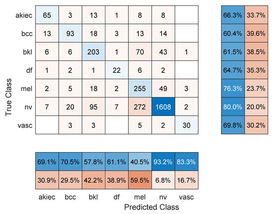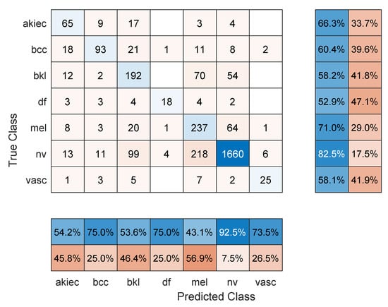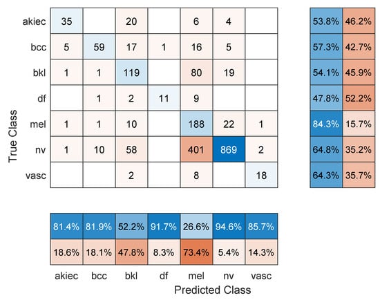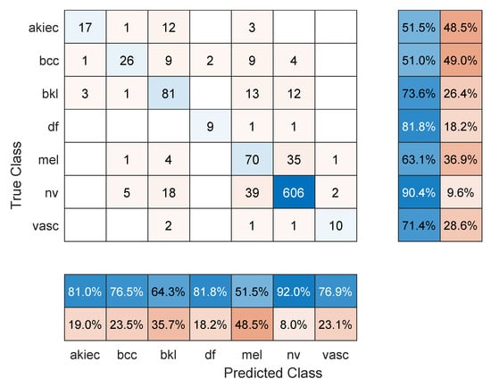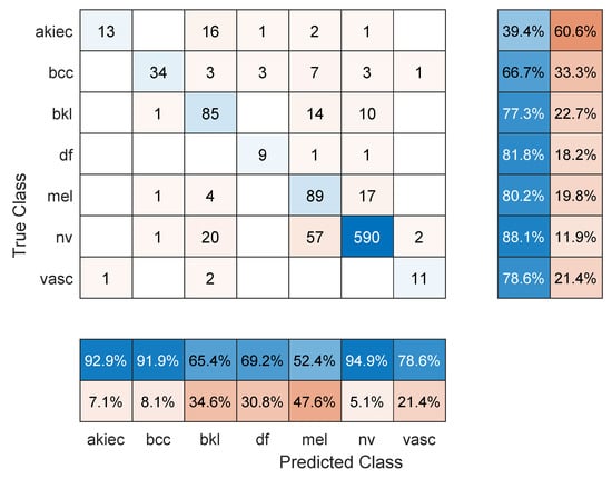 Although an increased size of the training dataset showed signs of promise, much is still desired to reach a reliable diagnosis system that surpasses screening requirements. However, some of the results were affected by the small number of images in each class. For example, in Figure 6, the class DF had 11 images, VASC had 14 images, and AKIEC had 32 images. Such numbers are extremely low for an effective deep learning model, and single errors will have a profound effect on overall performance indices.