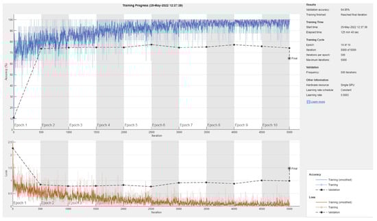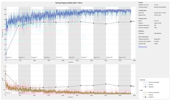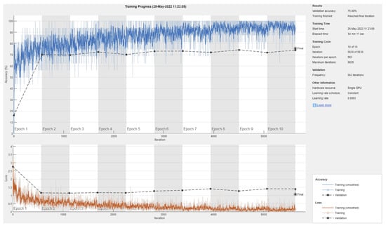 A further 10% increase in training data made the percentage of testing images 90% of the dataset. Table 3 shows the mean overall performance metrics over 10 runs of each of the 13 deep learning models. Three of the models (i.e., DenseNet201, DarkNet53, and ResNet101) achieved an accuracy above 80% with a corresponding F1 score of 74.4% for DenseNet201. The table shows steady improvement for most models with a larger set of training data over all metrics, except for the small model SqueezeNet. Generally, deep learning models, unlike traditional machine learning, benefit from larger datasets [44], which may be the reason for improved performance. The sample confusion matrix for DarkNet-53 in Figure 6 shows considerably better performance in terms of entries with one or fewer false misclassifications. However, the training/validation progress curve in Figure 7 still shows signs of overfitting.