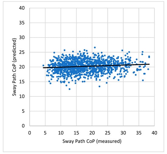 Scatterplot of the predicted (from Table 3 values) over the measured Sway Path CoP. The black line is a linear fit of the plotted points, just to help in the visualization.