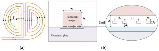 The energy conversion mechanism of the butterfly coil EMAT is shown in Figure 1. When the butterfly coils are supplied with high−frequency and high−power excitation current , it can be known from Ampere’s law that it will generate an alternating magnetic field around the aluminum plate. At the same time, eddy currents with the same frequency and different directions will be generated at the skin depth of the surface of the specimen. Under the action of the static magnetic field perpendicular to the surface of the aluminum plate provided by the permanent magnet, the eddy currents generate an alternating Lorentz force , so that the particles under the surface of the specimen produce high−frequency vibration, which creates ultrasonic waves inside the aluminum plate. The receiving process is the inverse process of the excitation procedure.
