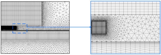 Due to the skin effect, the eddy current generated by the butterfly coil EMAT is primarily concentrated at the skin depth. Therefore, considering the accuracy and the amount of calculation of the 2−D FEM of the butterfly coil EMAT, it is necessary to refine the grid of coils, permanent magnets, and aluminum plates three times in the skin depth directly below the coils. The other areas are divided by a freely divided triangular mesh. The schematic of the 2−D model in COMSOL is shown in Figure 3.