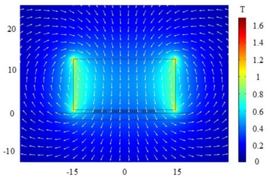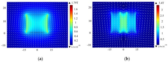 Figure 10 shows the distribution of static magnetic flux density under the EMAT optimized by orthogonal test theory and the improved EMAT with TSPM−OP, and the white arrow indicates the direction of the static magnetic field. It can be seen in Figure 10a that the static magnetic flux density for the optimized butterfly coil EMAT by orthogonal test theory is mainly perpendicular to the surface of the magnet, with the maximum flux density at the edge of the magnet. Figure 10b shows that the improved EMAT with TSPM−OP has both horizontal and vertical fluxes, with the static magnetic flux density mainly concentrated inside the magnets. It can be seen that the static magnetic flux density of the optimized EMAT and the improved EMAT are 1.79 T and 3.4 T, respectively.