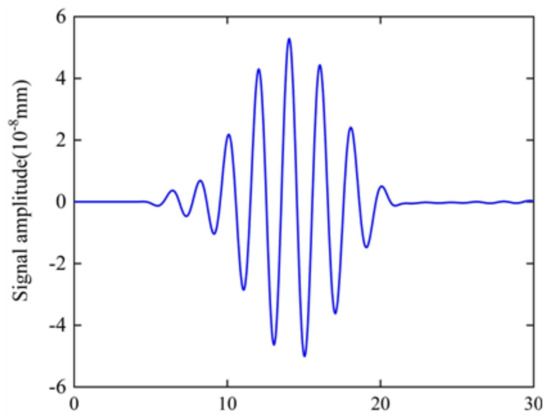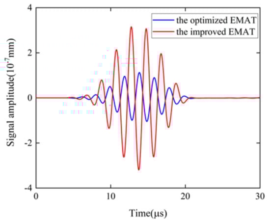 Figure 6 shows the average value and influence degree of each factor on the different results. It can be found that the factors that have the greatest effect on the signal intensity are the permanent magnet height and the coil number , followed by the permanent magnet width , the coil height , the coil width , and the lift−off distance , whereas the influence of the coil inner diameter is the smallest. It can be seen that a decrease in and , and an increase in and , have a positive effect on the signal amplitude. In addition, when = 0.2, = 0.15, and = 5, the signal amplitude is the largest. Therefore, in order to improve the energy conversion efficiency of the butterfly coil EMAT, the optimal parameters of the particular butterfly coil EMAT design modeled are = 25 mm, = 20 mm, = 0.2 mm, = 0.15 mm, = 5, = 2 mm, and = 0.1 mm. This combination of parameters is not included in the orthogonal array. In order to better observe the parameter changes, Table 5 shows the comparison of the parameters of the butterfly coil EMAT before and after the orthogonal test design. The simulation of the EMAT with these optimal parameters was performed, and the signal amplitude of the butterfly coil EMAT was calculated, as shown in Figure 7. The signal amplitude optimized by orthogonal test theory is 1.13 times greater than that before optimization.
