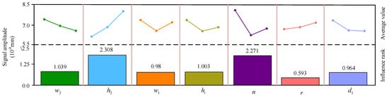 According to Table 3, the influence of each parameter on the signal amplitude and their preferred values can be obtained by orthogonal analysis, as shown in Table 4, where ( = 1, 2, 3) represent the corresponding signal amplitude at each level of the parameters, and R denotes the difference between the largest and the smallest values of . From Table 4, it can be seen that the parameter with the larger has the most significant influence on the signal amplitude. The order of effect of each factor is (2.308) > (2.271) > (1.039) > (1.003) > (0.98) > (0.964) > (0.593).