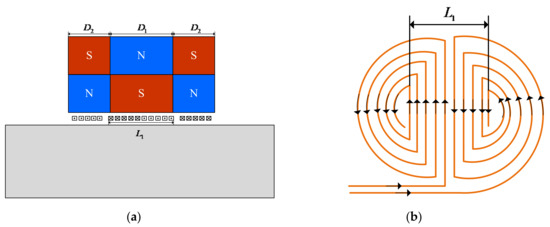 According to different properties of the specimen, the following mechanisms are responsible for the electro−acoustic transduction of EMATs: the Lorentz force mechanism, the magnetostrictive force mechanism, and the magnetizing force mechanism [32]. For non−ferromagnetic materials such as copper and aluminum, the mechanism of ultrasonic waves is the Lorentz force. For ferromagnetic materials such as iron, cobalt, nickel, and steel, the three kinds of working mechanisms described above are all included. In this work, aluminum is selected as the tested specimen, so only the Lorentz force mechanism is considered.
