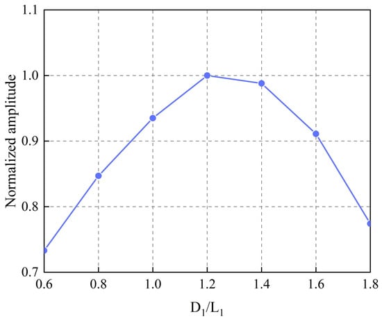 Therefore, a model with different values was established. The ratio of the width of the middle magnet to the width of the middle part of the coil ranged from 0.6 to 1.8 with a step of 0.1. The specific modeling parameters are shown in Table 6. It is worth noting that the width of the magnets on the left and right sides should be kept equal. The normalized amplitude for different values of is calculated as shown in Figure 9. Surprisingly, unlike the Rayleigh wave EMAT, where the magnet is slightly narrower than the coil [36], the normalized amplitude increases linearly with an increasing ratio in the range of 0.6–1.2, but when this range is exceeded, the ratio and normalized amplitude are negatively exponential. It can be seen that, for the particular EMAT with aluminum as the tested specimen, a critical of 1.2 is reached and the signal amplitude cannot increase further, but decreases. Therefore, the size of the magnets of the modified butterfly coil EMAT with TSPM−OP is determined to be = 6.72 mm and = 9.14 mm.
