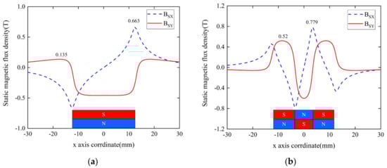 Figure 11 shows the distribution of static magnetic flux density on the surface of aluminum plates for the EMAT optimized by orthogonal test theory and the improved butterfly coil EMAT, BSX and BSY denote the X− and Y−components of the static magnetic flux density. In Figure 11a, BSX is zero at the center and reaches two peaks on both sides of the magnet, whereas BSY has a flat peak under the magnet face. Consequently, the static magnetic flux density of an optimized butterfly coil EMAT by orthogonal test theory is slightly larger towards the edges of the magnet. The maximum values of BSX and BSY are 0.663 T and 0.135 T, respectively. For the static magnetic flux density in the modified butterfly coil EMAT with TSPM−OP, in Figure 11b, BSX is zero at the center of the magnets and reaches a peak at the gap of the permanent magnet pair. The maximum values of BSX and BSY are 0.779 T and 0.52 T, respectively. Based on the above analysis, it is noteworthy that the static magnetic flux density component of the improved EAMT with TSPM−OP is much larger than that of the optimized butterfly coil EMAT, whether in the component parallel to the surface of the aluminum plate or perpendicular to the surface of the aluminum plate.
