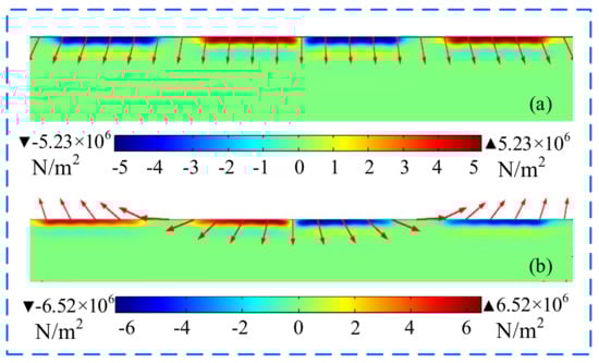 The distribution of Lorentz forces in the aluminum plate from (a) the EMAT optimized by orthogonal test theory and (b) the improved butterfly coil EMAT.