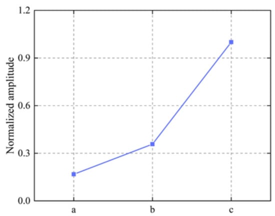Comparison of the normalized amplitude: (a) the traditional EMAT; (b) the EMAT optimized by orthogonal test theory; (c) the modified EMAT with TSPM−OP.
