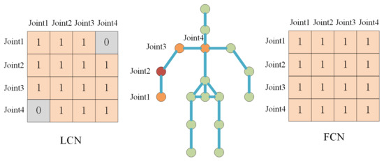 Figure 3 reflects the difference in the structure matrix between FCN and LCN. Taking Joint2 in the figure as an example, FCN considers the relationship between it and all other joints, while LCN only considers associated joints, such as Joint1, Joint3, and Joint4.