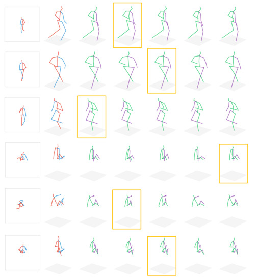 Visualization results on Human3.6M dataset. The first column shows the 2D poses estimated by the stacked hourglass network. The second column shows the ground truth offered by the dataset. The following 5 columns are the estimated hypothetical results generated by the hypotheses generator of the LCMDN, and the poses surrounded by orange frames are the final estimated poses selected by the LCMDN.