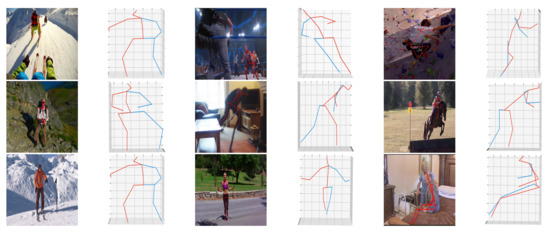 MPII dataset [41]: The MPII dataset is a small 2D human pose dataset with image data mainly from major video sites, such as YouTube, and it provides before and after unannotated frames. The MPII dataset includes about 25,000 images with human behavioral actions, including over 40,000 annotated human joints, covering 410 human activities, including walking, sitting, skiing, and hiking. It is one of the mainstream human pose datasets. Since the MPII dataset does not provide 3D pose information, we only report qualitative visualization results for the MPII dataset.