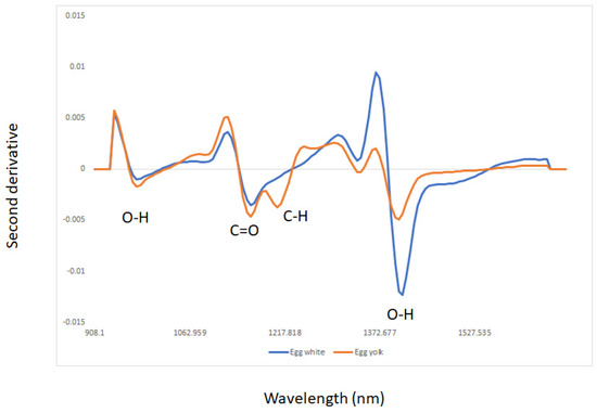 Average of the second derivative of egg white and yolk samples analyzed using near infrared reflectance spectroscopy.