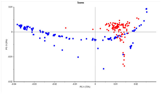 Principal component score plot of the egg white (blue squares) and yolk (red dots) samples analyzed using near-infrared reflectance spectroscopy.