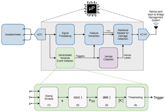 In this work, we examine an extension to a typical, current BSHM sensing node design (Figure 1) to investigate if vehicle detection can be performed without the need for additional instrumentation. To achieve this, we exploit the existing instrumentation, in this case, tri-axial MEMS accelerometers, which are widely employed within BSHM. Using the raw data from these accelerometers, we show that it is possible to detect regions of interest corresponding to vehicle crossings by tracking the increases in the generalised variance of the sample covariance matrix (computed between the channels of the muli-axial accelerometer) over a sliding window. Covariance-based event detection methods have been widely employed in other areas, including power systems measurement [17], video surveillance [18] and geophysics [19]. The approach is based on the observations that (a) during vehicle crossings, the measured multi-axial acceleration signals will exhibit covariance due to the systemic effect of the vehicle loading, and (b) in the periods between crossings, a rotation monitoring system only measures noise. Providing reliable tracking capability to an existing monitoring resource thus provides a high potential for a highly cost-effective approach. The validity and application is demonstrated here.