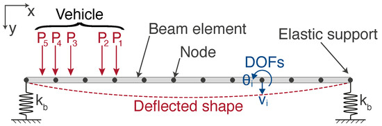 Typically, significant levels of rotation are only observed about the transverse axis, i.e., and , and similarly, displacements are only significant in the vertical axis. Figure 2 shows the two dimensional bridge FE model used to represent a 25 long by wide bridge. It is based on previous work described in [5], which gives a fuller description of the model. The one modification from the previous FE model is in the boundary conditions, where the supports are no longer idealised as being infinitely stiff in the vertical degree-of-freedom. It is widely understood that a physical bridge system has a spring coefficient associated with these supports. However, in numerical models, these supports are often assumed to be infinitely stiff as the vertical movement in the supports is very small, relative to the vertical deflections associated with the bridge deck bending. However, bridge rotation instrumentation (DC accelerometers) is commonly deployed near the supports as maximum rotation values are observed at the ends of spans, i.e., over the supports. Consequently, these sensitive instruments detect these small vertical movements at the supports. Hence, in this work, we are specifically interested in modelling the dynamics experienced by an accelerometer placed near the supports. Therefore, to model this behaviour more accurately, we have used elastic spring supports to represent this boundary condition better. The stiffness coefficient, , was assigned to these elastic supports from a commercially available elastomeric bearing’s datasheet, which met this structure’s design requirements. A damping ratio of 5% has been used.